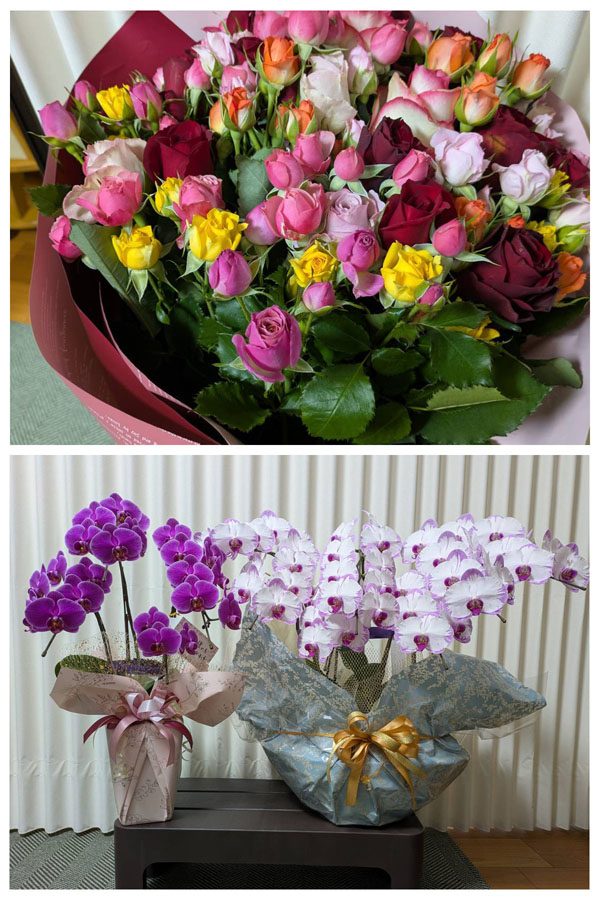 ④16年間地域のコミュニティーセンターに勤めた夫の退職祝いにいただいた蘭の鉢植えや花束から、多くの方々との御縁を感じ、ありがたく思いました。